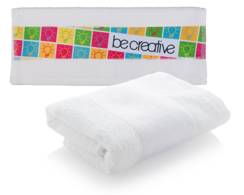 100% pamut, 380 g/m² törölköző poliészter bordűrrel, szublimációs emblémázáshoz. Az ár tartalmazza szublimáció költségét. Minimális rendelési mennyiség: 50 db.